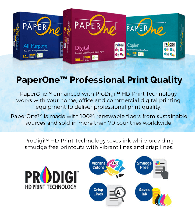 A proprietary technology developed after years of research, PaperOne™ is now enhanced with ProDigi™ HD Print Technology to obtain the highest print performance delivering smudge-free printouts with the most vibrant colours and crisp lines while minimising the amount of ink used.